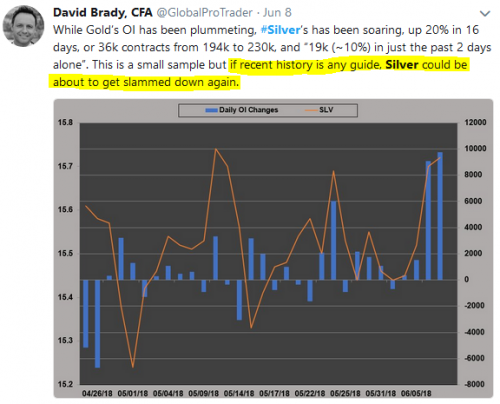Notice how OI rose significantly around May 10, and the price of Gold fell hard. Then OI fell consistently but the price did not rise, instead it remained capped under its 200-day MA. Then, beginning Tuesday, June 12 and for the next two days, open interest rose a total of 18k contracts. Given that the price only appears to go down when open interest rises and sideways when it falls, it seemed safe to assume that the price would fall on Friday as it did around May 10, and that is exactly what happened. In fact, open interest rose again on Friday for a cumulative 26k contracts in just four days.
