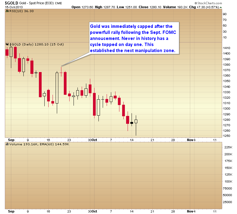 The next blatant manipulation of the gold market occurred right after the September FOMC meeting. Gold was immediately taken down the very next day creating a daily cycle that topped on day 1. Never in history has a gold daily cycled topped on day 1.