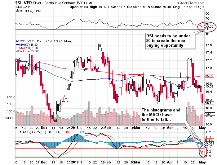 While we have had a really steep correction in the metals through month-end, and although silver is undeniably cheap, (Read this article by Jeff Clark, "The Coming Silver Supply Crunch Is Worse Than You Know") history would prove that after violent takedowns such as the past week, I am better off waiting for the Relative Strength Index (RSI) to move to an extreme position before adding. I have seen the silver RSI in the teens during particularly vicious routs and while this is not (yet) one of those, a number in the mid-to-high 20s would be a great entry point.