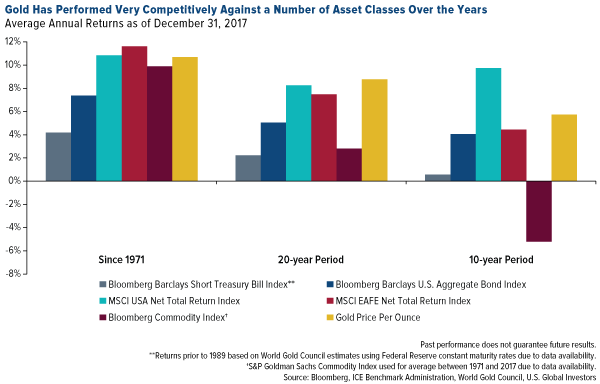 Gold has also performed competitively against many asset classes over the past few decades, as seen in the chart below. This makes the metal, we believe, an appealing diversifier in the event of a correction in the capital markets or an end to the bull market.