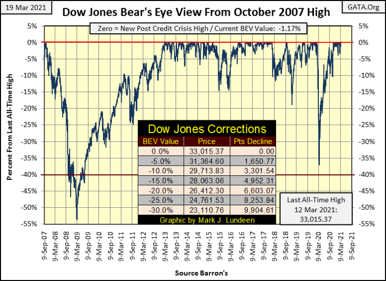 The Dow Jones made a BEV Zero on Wednesday last week, then closed the week down 1.17% from Wednesday’s all-time high. The Dow Jones has been in scoring position (within 5% of its last all-time high) since November 4th, scoring 22 new all-time highs, advancing the Dow Jones by 5,167 points during the past three and a half months.