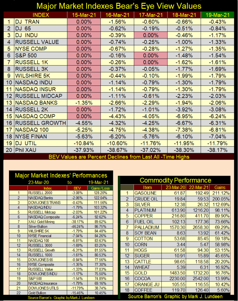 The major market indexes’ BEV values are listed in the table below. Monday saw lots of new BEV Zeros. But on Wednesday when the Dow Jones (#3) saw its last BEV Zero, it didn’t have much company. Seeing at week’s close fourteen of these indexes in scoring position, within 5% of their last all-time highs is a good reason to cheer for my bullish brethren out there.