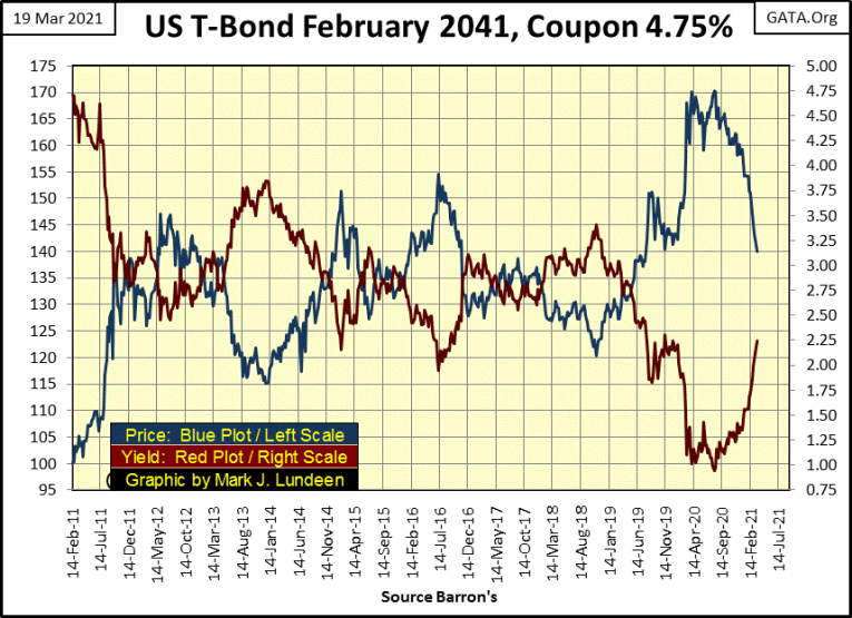 In fact, since last August it already has, as seen in this 30yr US Treasury Bond I’ve tracked on a weekly closing basis since it was issued in February 2011. Since last August, this bond’s current yield (Red Plot below) increased from 0.95% to 2.24% as its market price (Blue Plot) deflated by 17.76%.