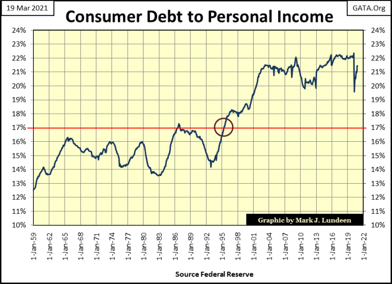 So much for that. Let’s move on to the Consumer Debt to Personal Income Ratio in the chart below. The series used in this ratio are seen in the chart of Consumer Debt and Personal Income; two charts up.