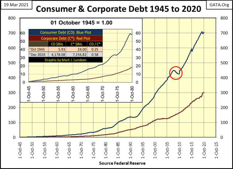 Here’s a chart on consumer and corporate debt going back to 1945. Since 1945 consumer debt is up by a factor of 700. That can’t be good. Look at the levels of debt consumers and corporations had in October 1945; consumer debt was $5.93 billion dollars and corporate debt coming out of WWII was an immense $24 billion dollars. Today in 2021, $24 billion dollars just isn’t the same