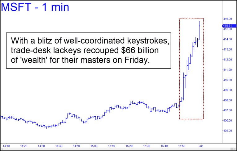 It was Microsoft, the world’s most valuable company, that had led the way down. The software giant got sacked for a 3.5% loss on Thursday and was down an additional 2.5% at mid-session on Friday. In wealth-effect terms, this represented a loss of about $180 billion. But before the repo man could seize a single yacht or Cessna Citation, Microsoft trampolined exuberantly off its lows, pushing the Nasdaq and virtually all the lunatic stocks into one of the steepest, broadest ascents in recent memory. Presto! The alarming divergence between the Dow and nearly everything else was cured. It all happened in the final trading moments of the month, tape-painting so brazen as to make a joke of the SEC and other supposed “regulators” of securities markets.