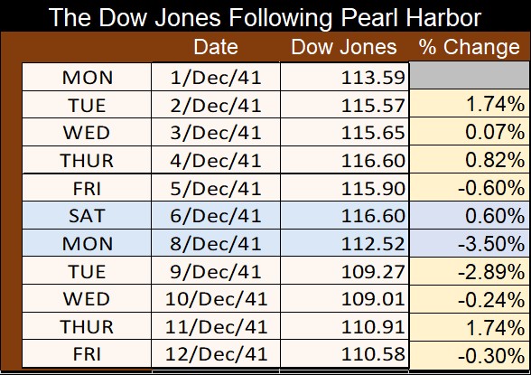 As seen below, following, Pearl Harbor on Sunday, December 7th, the Dow Jones was down 3.50%. Which is almost nothing, considering the global impact Pearl Harbor had on global political-economics since 1941.