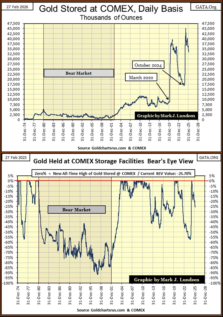 Looking at the gold inventories held at the COMEX below, we see oddities; oversized swings in holding of gold at the COMEX. Starting in March 2020, gold holdings are either surging, or draining from the COMEX. What does all this mean? I haven’t a clue. But I like looking at market data for those times when extremes happen, exactly as seen below, as such extremes may prove to be precursors to bull or bear market’s top or bottom.
