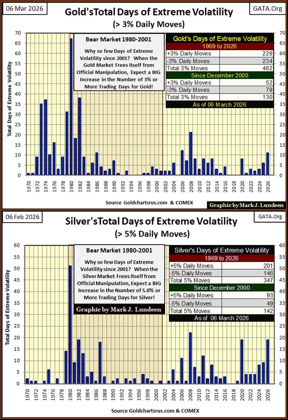 A big reason for me to think that, is seen in the chart below. Gold’s days of extreme volatility, days where gold moves more than +/- 3% from a previous day’s closing price, has jumped up greatly so far in 2026.