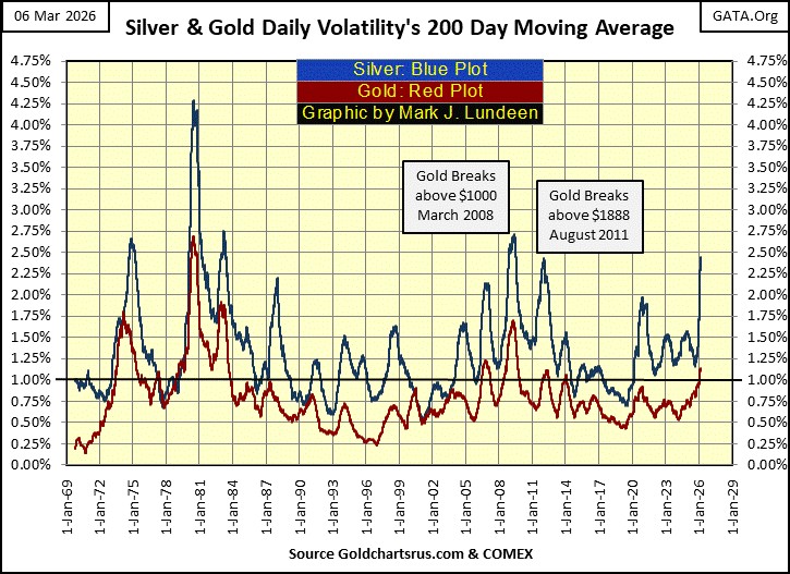 Silver, as seen above, has seen nineteen extreme days so far in 2026. Why daily volatility has increased as it has for gold and silver, as seen in their days of extreme volatility seen above, and in their Daily Volatility’s 200D M/A below, I don’t exactly know. But so far, this increase in daily volatility has proven to be bullish for the old monetary metals.