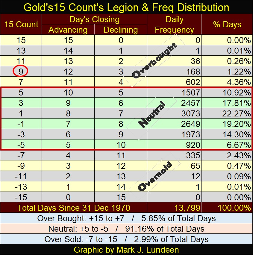 That plus, since Thanks Givings in late November, gold’s 15-count has been positive, indicating advancing days outnumber daily declines, and gold’s 15-count has seen frequent +7s, indicating gold is an overbought market. Looking at the table below, a 15-count of +7 doesn’t happen very frequently.