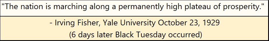 In October 1929, just six days before the bottom fell out from under Wall Street, Irving Fisher, an economist from Yale University, who at that time had what we today would call “Rock-Star Status,” declared the follow;