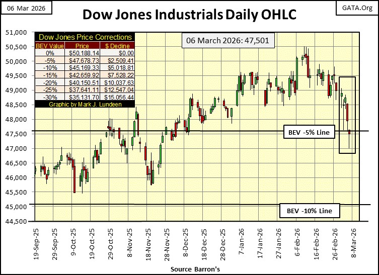 Not on this week’s close. That, plus on Tuesday this week, the Dow Jones in mid-day trading, broke fifty-dollars below its BEV -5% line at 47,678, on its daily low (47,628). It then closed up for the day by eight dollars, eight-dollars above where it opened the day at 48,493. Looking at the Dow Jones in its daily bar chart below, on Tuesday when the Dow Jones broke below its BEV -5% line, someone didn’t want the Dow closing below scoring position. Then on Thursday, once again this week the Dow Jones traded below its BEV -5% line, before pulling back up, to close down, but still in scoring position for the day.