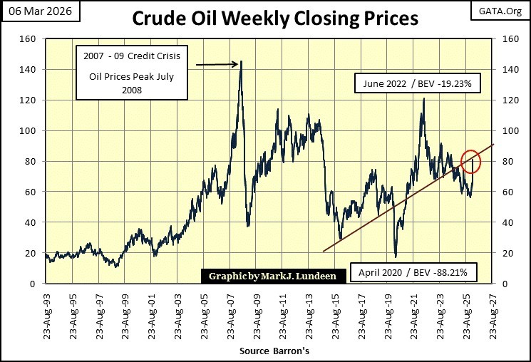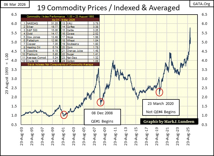 I keep a file for weekly closing prices for some commodities, as seen in chart below. I indexed these commodities to 1.00 = 23 August 1993, then average these weekly indexed values, from August 1993 to this week’s close. This commodity price average, does not include the stock averages seen in the chart’s table. At this week’s Thursday’s close, the average for these commodities (#11 in the table), was up by a factor of 5.24, since August 1993.