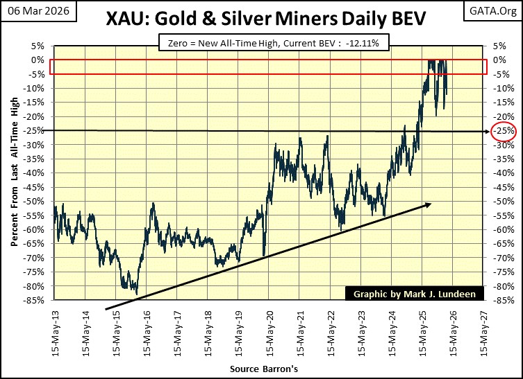 Yes it did. But if you study the XAU’s BEV chart below, since the XAU began making new all-time highs again in August 2025, they have been very volatile. Seeing the XAU’s BEV value decline to -20% would not necessarily bearish for the gold miners. For the precious metal miners, maybe scoring position should be between the BEV Zero (0.0%), and their BEV -15% lines.
