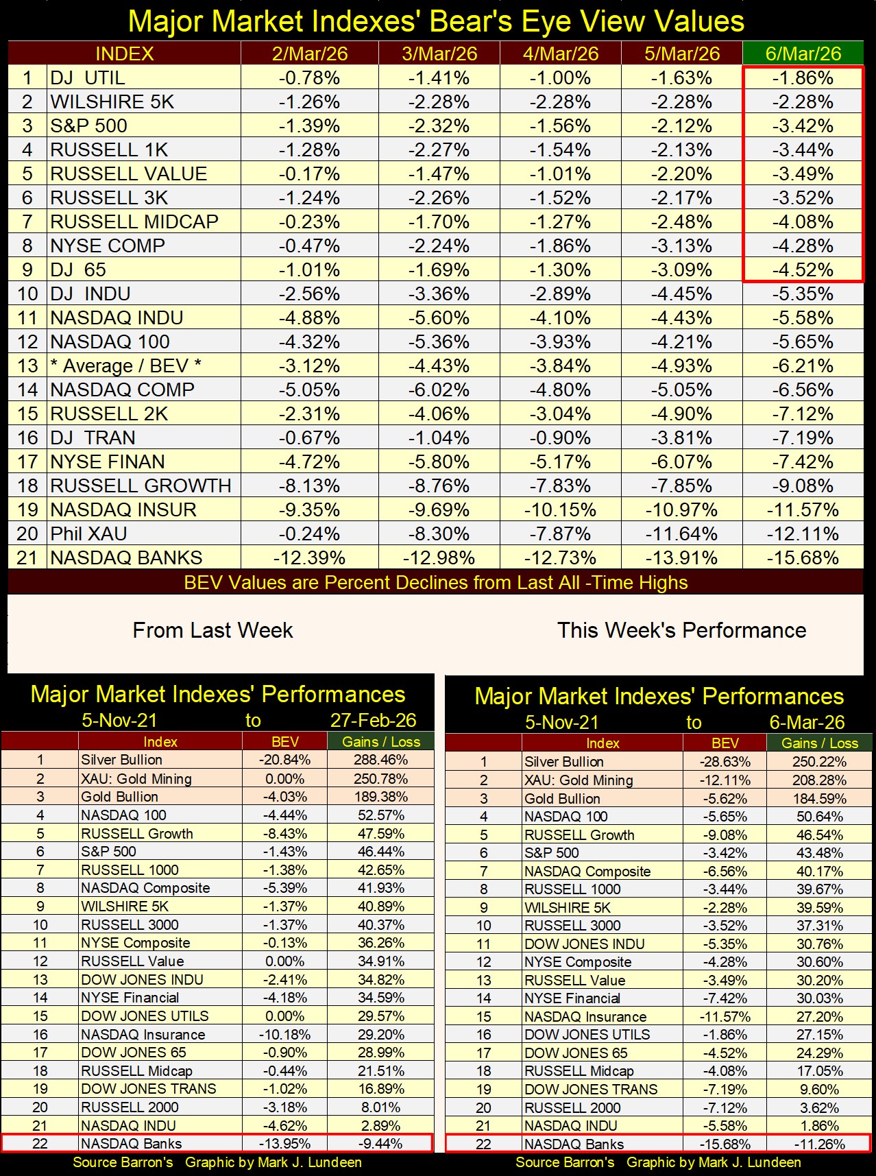 Look at the XAU at #20, it closed the week 12.11% below its last all-time high, which is exactly what a BEV of -12.11% means. But not seen this week, is on Thursday and Friday of last week, the XAU closed at BEV Zeros (0.0% = new all-time high). So, the gold and silver miners lost over 12% from an all-time in a single week!