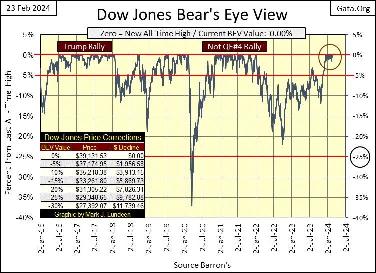 This week on Thursday and Friday, the Dow Jones in its BEV chart below made its 20th & 21st BEV Zero of the rally. A rally that began last November when it closed in scoring position, a close above its -5% line, and the Dow Jones has stayed there since.