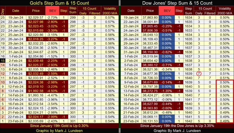 Again this week, the steps sum tables below, for gold and the Dow Jones best illustrates the bull-market dichotomy between gold and the Dow Jones. Where are all the BEV Zeros for gold?
