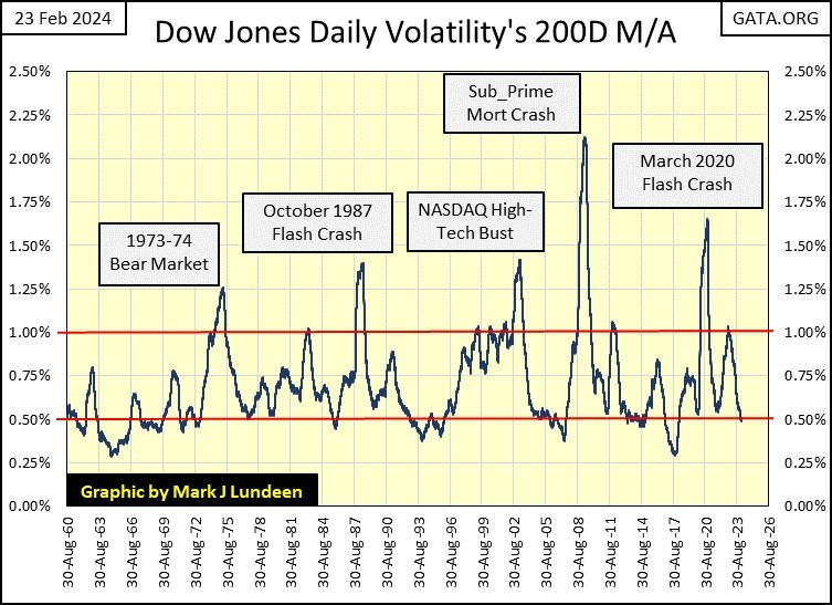 Seeing the Dow Jones this week close with a daily volatility’s 200D M/A of 0.49% signifies the Dow Jones’ advance is close to a market top; a place where risks are maximum and the potential for reward minimum.