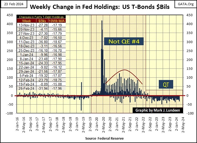 How long can the stock market rally? It shouldn’t be rallying at all, not with the idiots still shrinking their balance sheet, as they have since May 2022, as seen with the QT in the chart below. But somehow, someway, “liquidity” has been flowing into the stock market. So, the Dow Jones and other major market indexes are closing at new all-time highs once again.