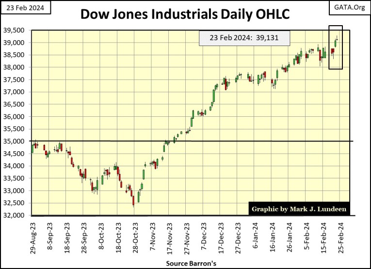 Here is the Dow Jones in daily bars below. Wednesday, I was going to call 39,000 the new line of resistance to the Dow Jones, like 38,000 was from mid-December to mid-January. Then came Thursday and Friday, and I now believe I’ll have to increase the Y-axis to something over 40,000 in the coming month.