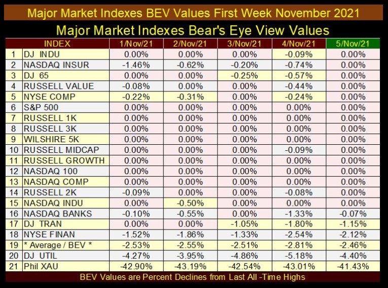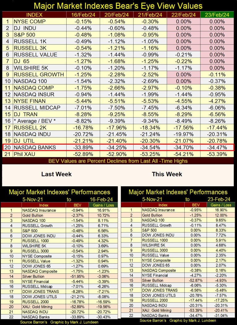 Except for the XAU, tail-end Charlie at (#21), whose last BEV Zero (0.00%) was in April 2011, things looked glorious on Wall Street in November 2021, just before it began a correction that bottomed in autumn 2022. Look at the NASDAQ Banking index (#16). Wednesday November 3rd was its last all-time high, and the banks have been lagging ever since.