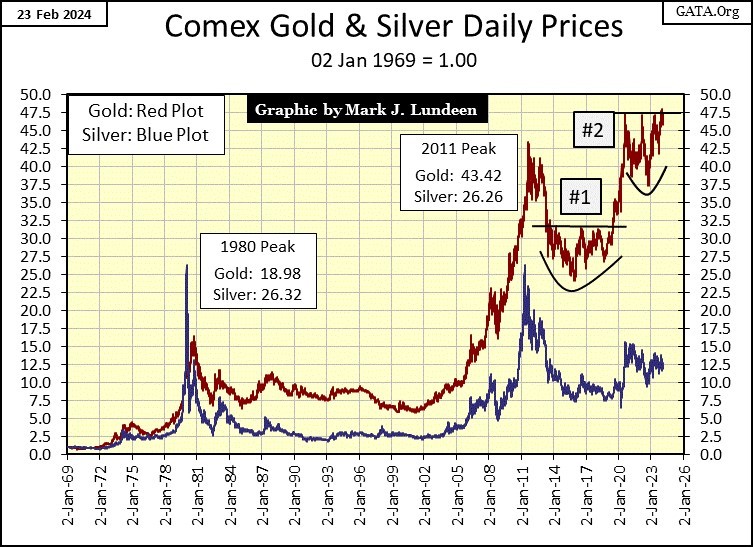 Look at the chart below plotting the indexed values of gold and silver going back to 1969. Since its high of the 1969 to 1980 bull market, gold (Red Plot) has advanced nicely, making many new all-time highs in the decades that followed.
