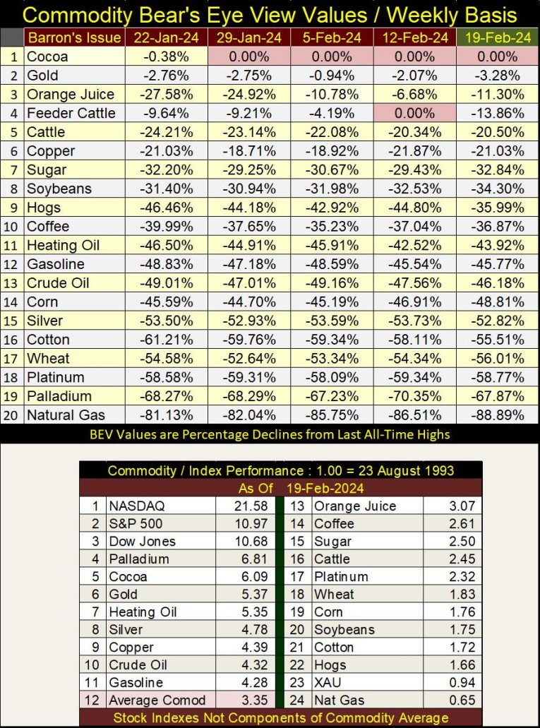 Cocoa has seen new all-time highs (0.00% / BEV Zeros) for the past four weeks, and feeder cattle two weeks ago. But everything else remains far below even scoring position, with sub -30% BEVs common. So, if inflation is making a comeback, it isn’t the producers of these commodities, like farmers and miners benefitting from these price increases.