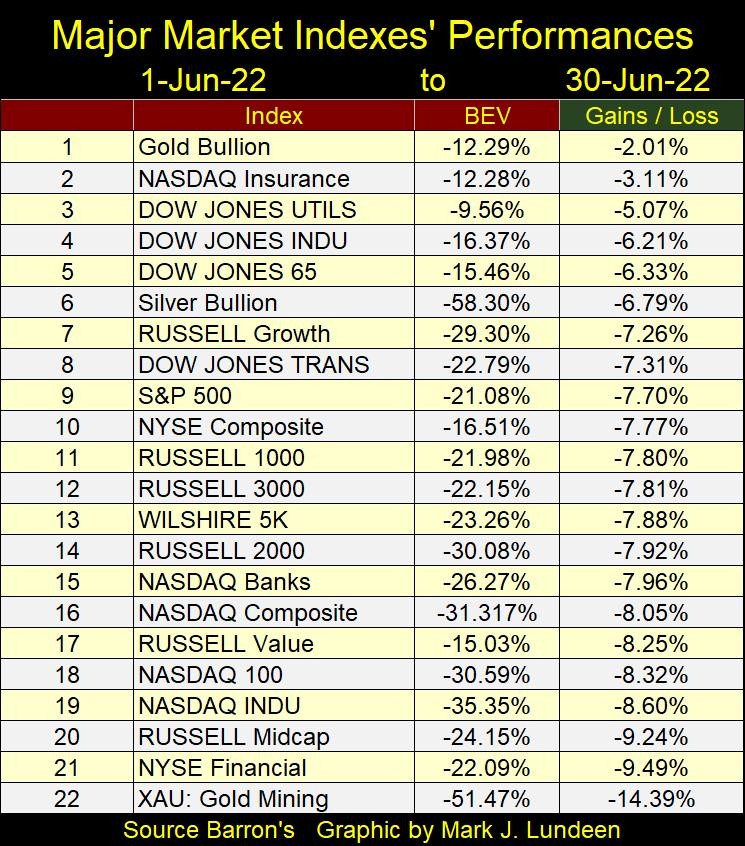 Back to the topic at hand; the “liquidity” drained from the Fed’s balance sheet in June 2022. The idiots managed to drain only $12.17 billion dollars in June. Most likely for the reasons seen in the table below – valuations in the stock market are deflating. Had the idiots actually drained all $50 billion dollars promised in May and June ($100 billion total as originally announced), where would these major market indexes be today?