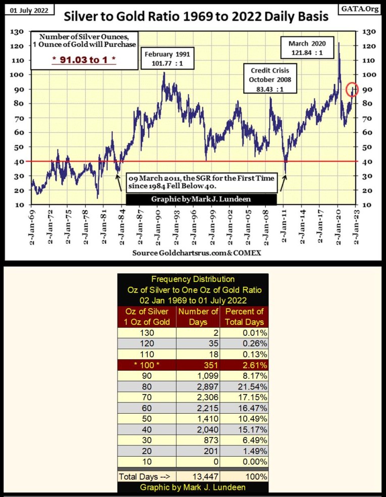 I think we may be coming to a bottom in the precious metals’ current time of troubles. Case in point is that the Silver to Gold Ratio went above 90 at this week’s close, actually 91.03 ounces of silver for 1 ounce of gold. That’s 5.69 POUNDS OF SILVER for one ounce of gold.