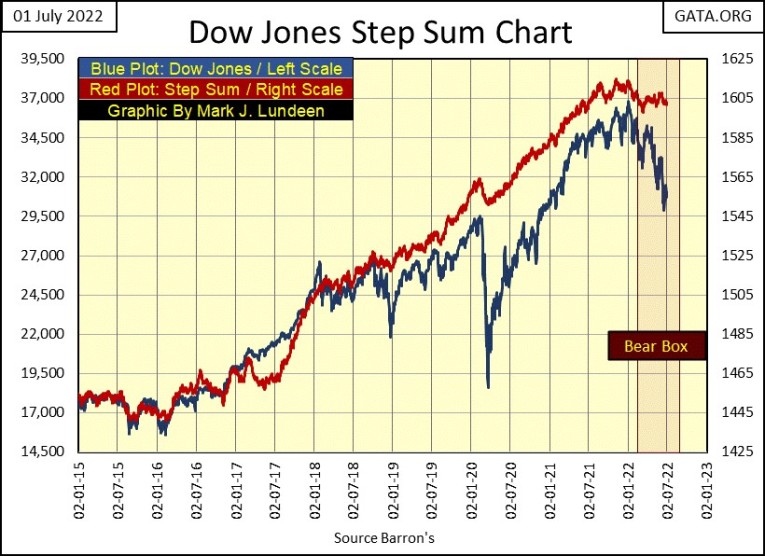 So, why are there so many negative 52Wk H-L nets in the table above? This is what happens when stock market valuations come under pressure, resulting in the step sum current dip down in the chart below. Our dip began in early January 2022, and I expect it will continue taking this step sum down until this bear market hits a bottom. Possibly only the first a several bottoms before Mr Bear is satisfied with his work, and departs from Wall Street.