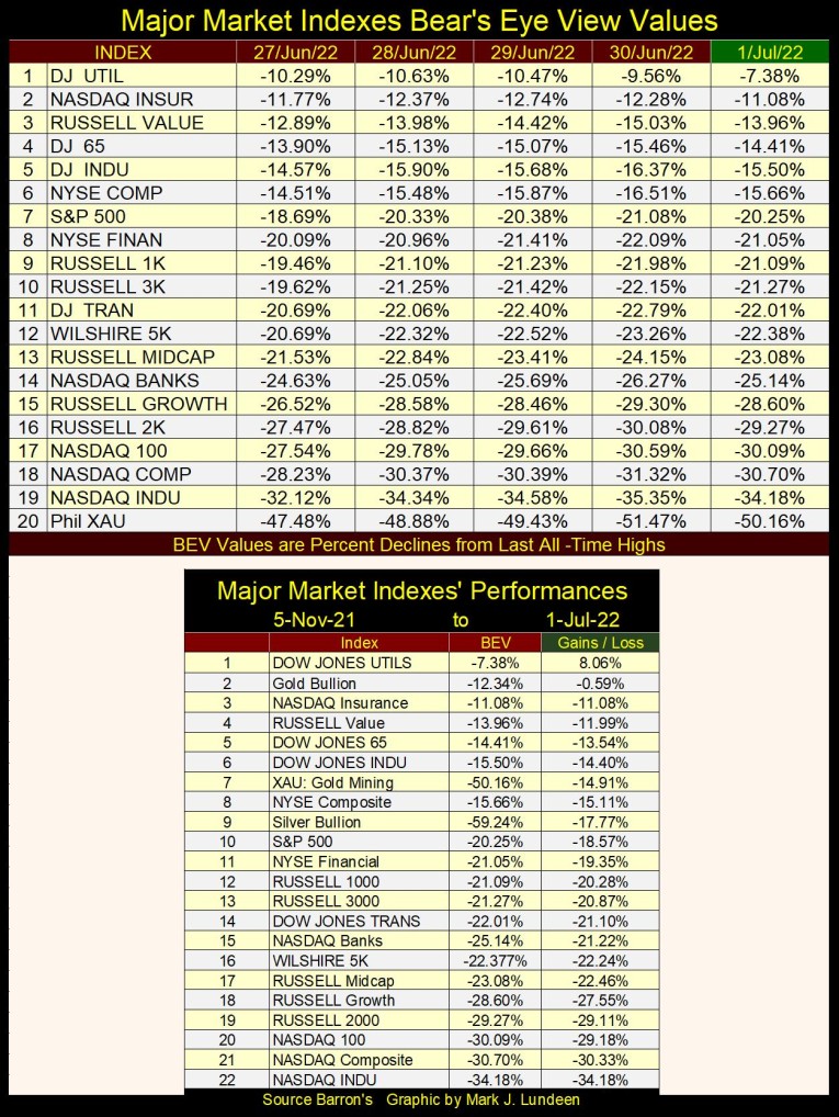 This week the Dow Jones closed with a BEV of -15.50%, not yet breaking below its BEV -20% line in this market decline. Who knows, maybe it won’t. Maybe it will now turn around and go on to new BEV Zeros below, taking the rest of the major market indexes up with it. That would not be very likely in my opinion, but it could.