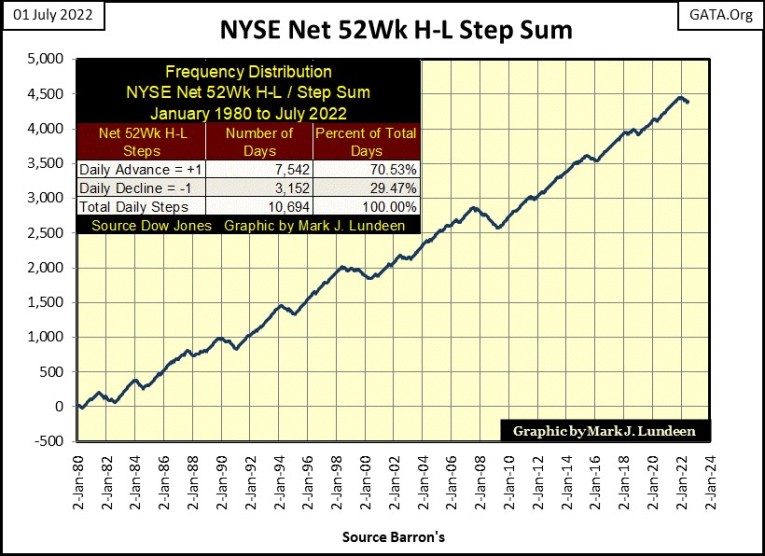 Seeing 52Wk Lows dominate trading at the NYSE isn’t normal, as seen below where I plotted a step sum for the NYSE 52Wk H-L nets. Any day with a positive 52Wk Net (more 52Wk highs than lows) is equal to +1. Any day with a negative 52Wk Net (more 52Wk lows than highs) is equal to a -1. The step sum plotted below is the running sum total of all these +1 & -1 since January 1980.