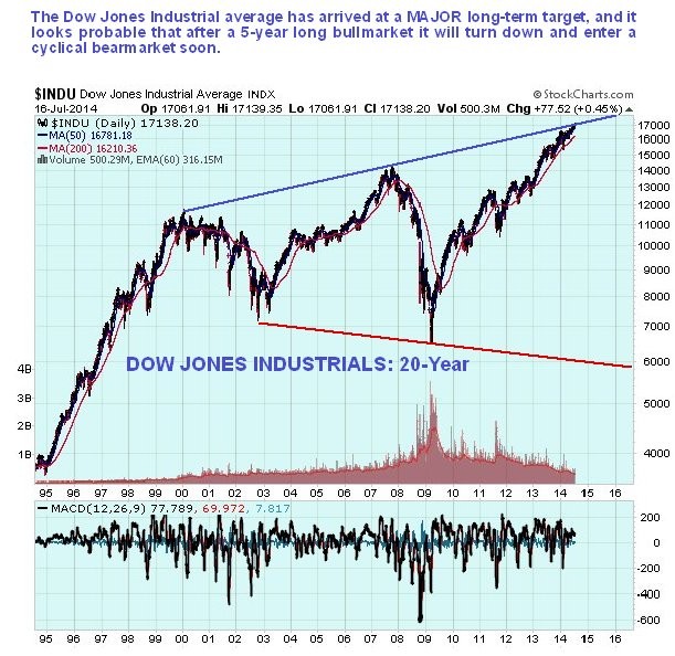 Looking at the US bull market on an 8-year chart for the S&P500 index, we can see that it has taken the form of a large bearish Rising Wedge, which is displaying a number of important negative characteristics. One is that volume has dropped back steadily as the rally has continued. Another is that volatility has dropped back to an extremely low level, as shown at the top of the chart, with corrections become smaller and smaller, which is a sign of extreme complacency. With the index now contacting the top boundary of the Wedge, it’s a good time to dump any mainstream stocks you may have, and to consider bear ETFs etc. We could see the index meander about until the Fall, as it will have to traverse back across the narrowing Wedge before it can break down from it – it’s when it breaks down beneath the lower boundary of this Wedge that the real downside fireworks will start.