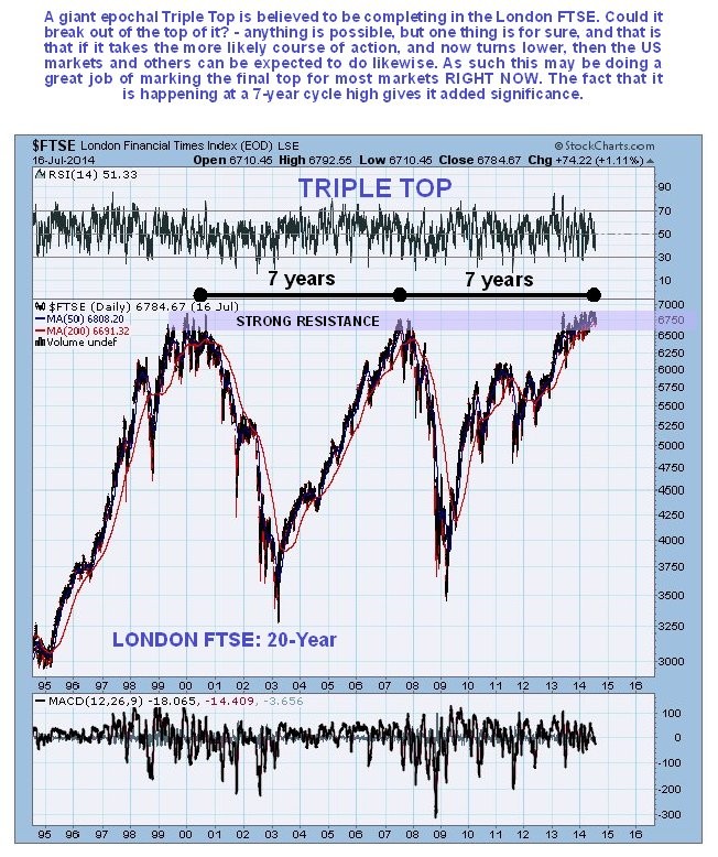 To start with, two major market indices, the US Dow Jones Industrials Index, and the UK FTSE Index, have arrived at major long-term targets. We can see that on their 20-year charts shown below. The Dow Jones Industrials have arrived at the upper boundary of a giant bullhorn pattern, while the UK FTSE is completing the third peak of a gigantic Triple Top.