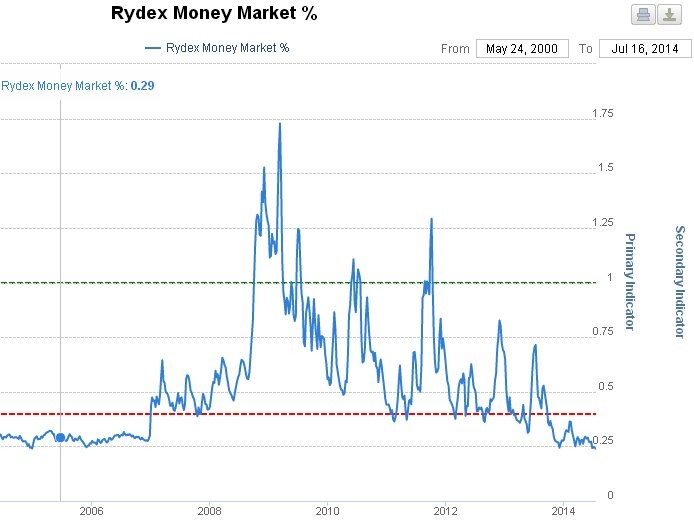 The Rydex Money Market % shows that Rydex traders are about as fully committed to the market as they can be, with their money market funds down to the sort of levels last seen in 2007 !!!