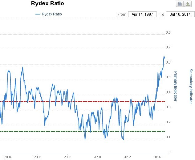 The Rydex Ratio, which measures the assets in the bullish funds in relation to total assets in the bullish and bearish funds, is at an extreme reading well beyond what we saw in 2007 ahead of the market crash, which is yet another warning !!!