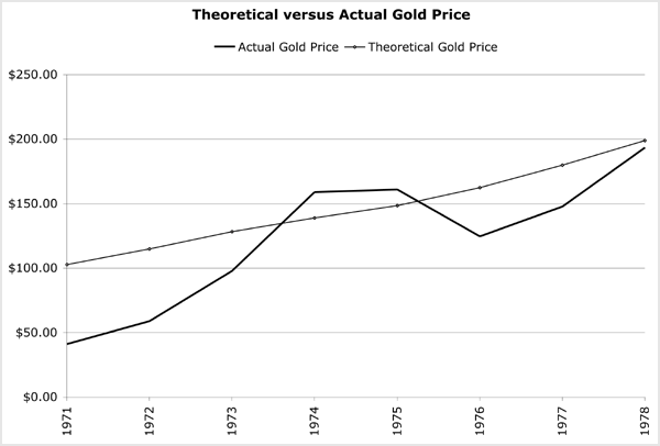 The fact that there is, on average, only a thirteen percent difference between the actual gold price and the theoretical gold price for the five years from 1974 to 1978, is astonishing. But not if gold is behaving as money: a currency currently independent of any government, whose value is market determined.