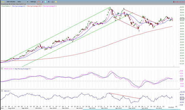 On Friday, UUP looked as if it were desperately trying to avoid another down leg in its consolidation pattern. If it cannot follow through on the upside early next week, it may have to continue the corrective pattern which started after the March top. If so, this could have some implications for the next two indices. Both tend to run contrary to the dollar.