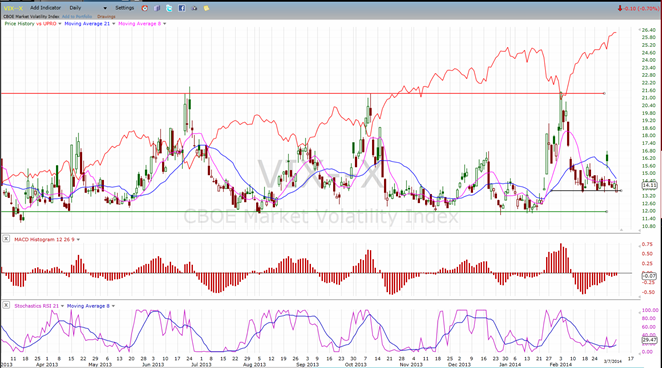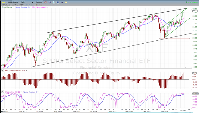 That is the market condition as I see it, as of Friday’s close!  Furthermore, the trigger might have already been pulled on Saturday by China reporting that its exports fell sharply in February. News of this nature normally has a negative effect on the market, and Friday (which had the potential for being a positive market day) turned out to be very tentative -- as if traders were waiting for some news which could affect Monday’s trading.  On the other hand, that concern could also have been the result of a potential deterioration of the Ukraine situation over the weekend.  Whichever!  The probability of an imminent retracement is real and one should be prepared for it.  This does not mean that I am calling for the top of the bull market.  Although this condition could develop into a long-term decline, it is too soon to make such a forecast.