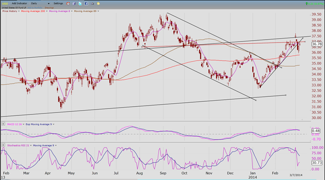 As expected, USO has met with resistance at the top of the green channel which coincides with the lower portion of an important overhead resistance area.  USO’s inability to push higher into that overhead formation is a sign of weakness.  If it does not quickly try to move higher, we can expect the beginning of another short-term downtrend.