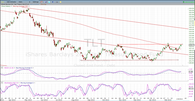 TLT did not give much ground when it pulled-back and has since returned to the resistance area that stopped it before. The formation (cup with a handle?) is bullish and intimates further upside movement. According to the base that was built as a perfect fulcrum on the P&F chart, TLT is capable of moving up to 116. This sounds logical since it would correspond to the top of its declining channel. Surely, SPX will not continue to move higher if this happens to TLT!