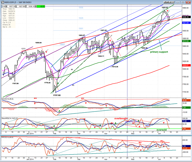 I have drawn several channels to facilitate keeping track of the trend. As you can see, we started another up-phase at 1738 which now consists of two separate phases. Both phases fit within the blue channel. They are outlined by green channel lines. We will now focus on the second phase which may have come to an end on Friday after reaching the top green channel line. There are also some internal trend lines drawn within the green channel that will be discussed in the context of the analysis. First, we have the lines forming a narrow up-channel from 1862. The correction has already moved well outside of that channel and come to rest at the junction of two trend lines: one is the extension of the trend line which connects the 1814 low and that made on 5/07. The other is a parallel to the larger blue channel lines drawn across the 1842 low. These intersecting lines add their support to the top of the trading band from 1916 to 1926. It’s no wonder that the index bounced after reaching 1926.