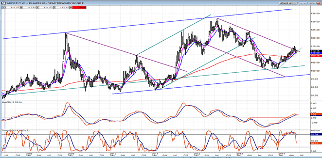 The weekly chart of TLT gives us a good perspective about its long-term activity. After establishing a substantial base in the 85-90 area, TLT made a rapid advance to about 123 which could not be sustained, and it dropped back into the base for some additional bottoming action. In January 2011, it finally moved out of the base decisively and established an 18-month uptrend which took it to 132. From that level, it reversed its course for an equal amount of time, finally finding good support just above the 100 level.