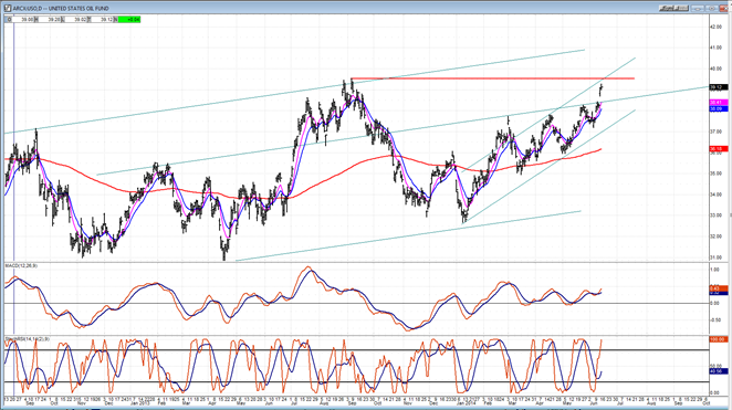 USO has benefitted from the conditions in Iraq and has risen above its resistance line. It is now ready to challenge last September’s top and, if successful, the top of its rising channel. Even if this were accomplished, it would still be far below its bull market top of April 2011, and it is doubtful that it could progress above 41 before falling back again.