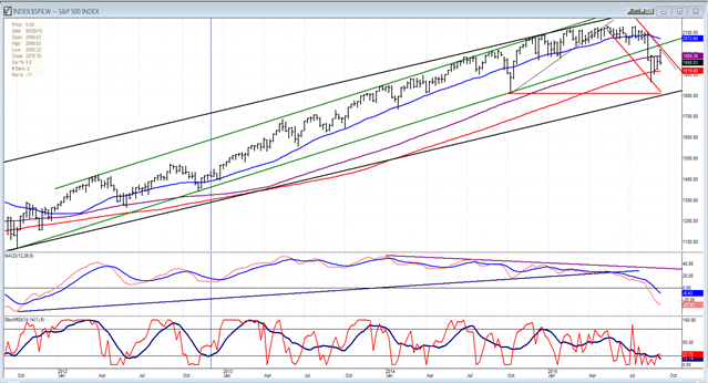 Now that we are seemingly in an intermediate downtrend, we should analyze the Weekly SPX chart (courtesy of QCharts.com, as well as others below) in order to get a larger perspective. The green channel, which represents the uptrend from the October 2011 low has been penetrated to the downside, but not the longer term (black) channel from the 2009 low. However, the DJIA, which is not influenced by high flying stocks has violated its long term channel. That does not mean that the bull market has ended. To come to that conclusion, much more weakness will have to occur. For now, because of the duration of the pull-back and the prospect that there will be more immediately (and into early October) we know that this is more than a short term correction but, so far, it does not rank very high in length as one of intermediate nature.