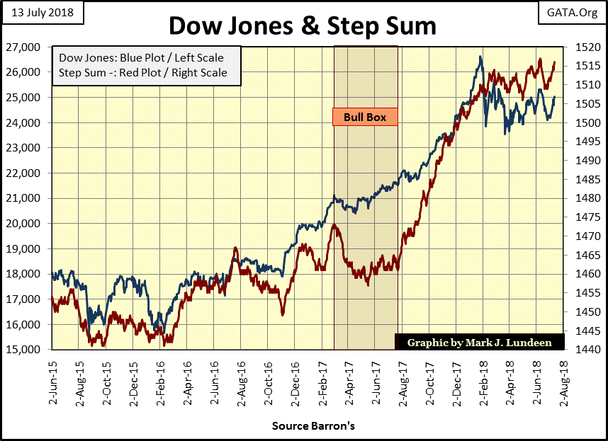 Here’s the Dow Jones in daily bars, the box contains the past five weeks of the daily ups and downs in the Dow Jones, the same five weeks recorded in my step sum table below. The most noticeable fact of this market is how it’s shed the volatility that plagued it from February to early April. Seeing the Dow Jones approaching its BEV -5% line above, in the bullish-baby steps seen at the far left of the chart below tells me this is a market that could very well see new all-time highs in the next month or two.