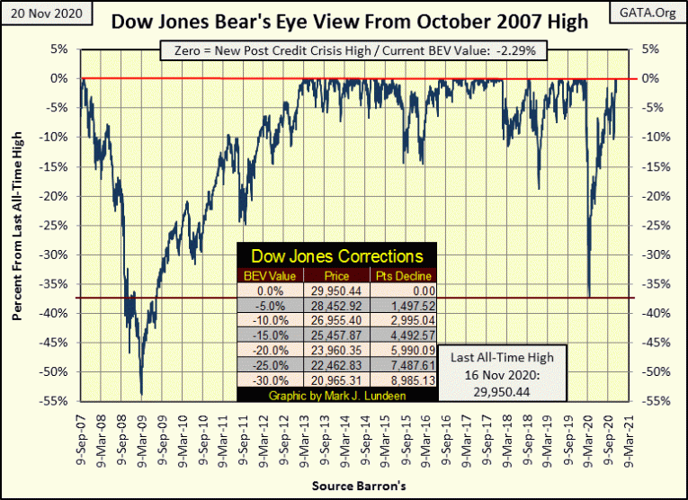 On Monday November 16th, the Dow Jones made its first BEV Zero in the Bear’s Eye View Chart below since last February, but fell short of taking out 30K by about fifty points. With four days left in the trading week, one could be forgiven to assume on Monday night we’d close this week above 30,000. But that wasn’t to be as the Dow Jones closed the week 687 points below Monday’s all-time high.