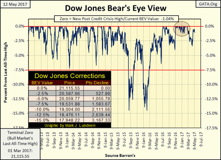 Instead, silver as seen in the Bear’s Eye View (BEV) chart below, is at week’s end down some 66% from May 2011.