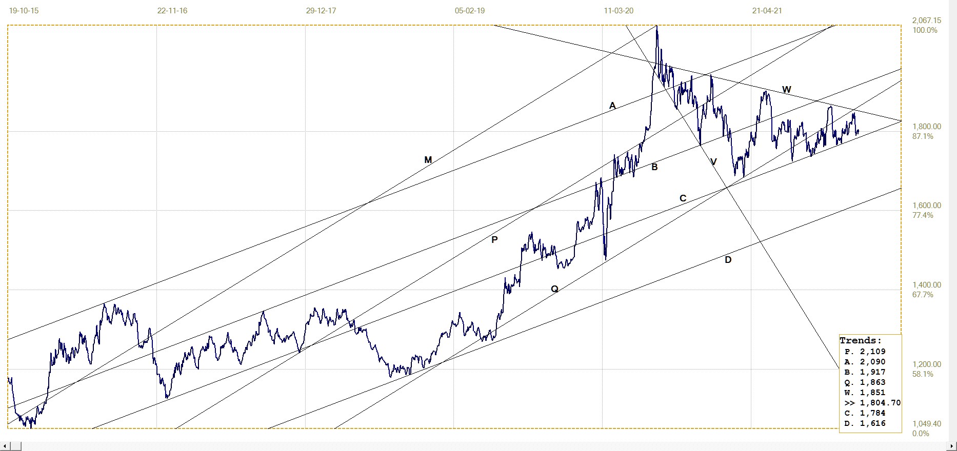 Confirmation of a bear market for the S&P500 will come with a break below bull channel JKL, currently with support at 4059, and rising. A target could be line D, passing through the pre-March 2020 high, which is now at 3477. A similar long term target for the DJIA – should a good sell-off take root – is line X, currently at 21 619. Line X on the chart of the Nasdaq, currently at 6431 implies that the technical market has more downside than Wall Street proper as represented by the DJIA and S&P500.